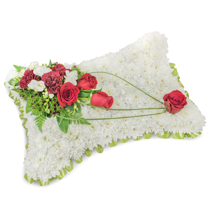 Offer your sincere condolences with our classic flower arrangement, featuring a timeless mix of white chrysanthemums, rich red roses, fragrant white freesias, and dark red carnations. Accented with elegant dianthus and soft bear grass, this bouquet embodies both beauty and uniqueness.